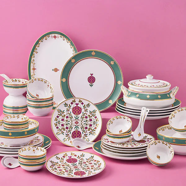 Our Anar Bagh’s vibrant dinner set is the epitome of sophistication. Including dinner plates, side plates, bowls, and elegant cutlery, this set is perfect for creating a stylish table setting for any occasion, from casual family dinners to formal gatherings. Crafted with attention to detail, our dinner set will enhance every meal with its timeless beauty.