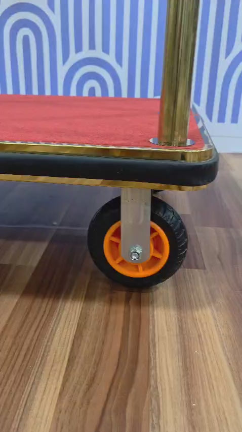 6“ TPR wheels 2 fixed and 2 swivel, frame is well bolted to understructure to prevent shaking, premium black / red carpeted deck, with protective full wrap around bumpers on all sides.. Size 1070 x 620 x 1870 mm Height ( delivered knock down to be asembled at site )