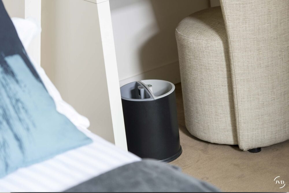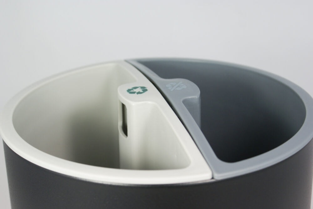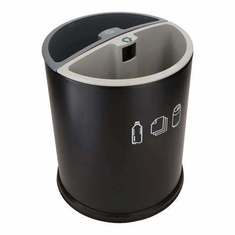 Kanda Recycle Bin, round 10 litre, H270/W225mm, metal with 2 inner plastic liners, recycle images printed on the outside bin, Black
